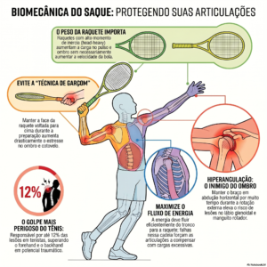 Em linguagem simples: sempre que o tenista saca, ombro, cotovelo, punho e coluna recebem uma combinação de tração, compressão, cisalhamento e torção. Uma vez ou outra, o corpo aguenta. Centenas e milhares de repetições, feitas com técnica ruim, fadiga, má escolha de equipamento ou calendário pesado, podem abrir caminho para dor e lesão .